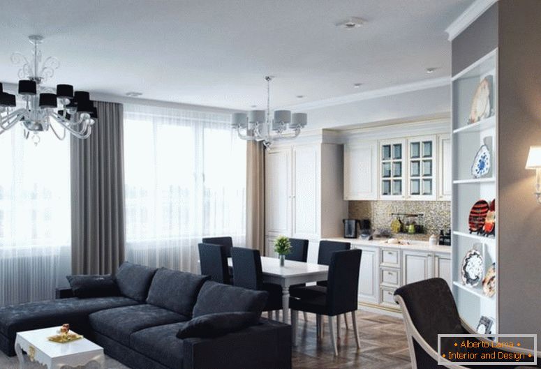 Část návrhářů nábytku zakoupených v IKEA a některé na zakázku. Nábytek musel být vestavěn, jednoduchý tvar. K tomu, aby dům byl prostornější, mistři používali zrcadla a lesklé povrchy. Jako základní barvu si vzali čistou bílou barvu, přidali ji k fialové a trochu zelenou. Jasné nekomplikované akcenty dávají individualitě do interiéru.