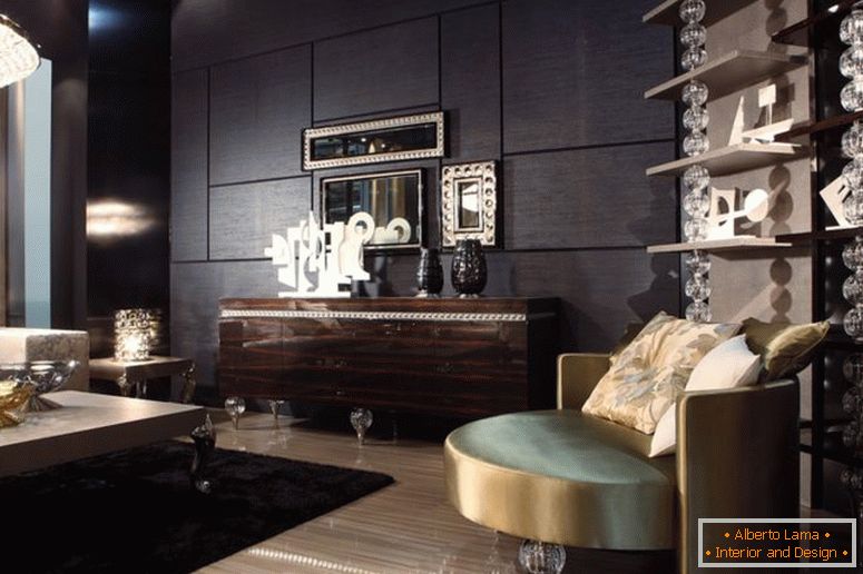 Stěna obývacího pokoje je úplně ucpaná policemi