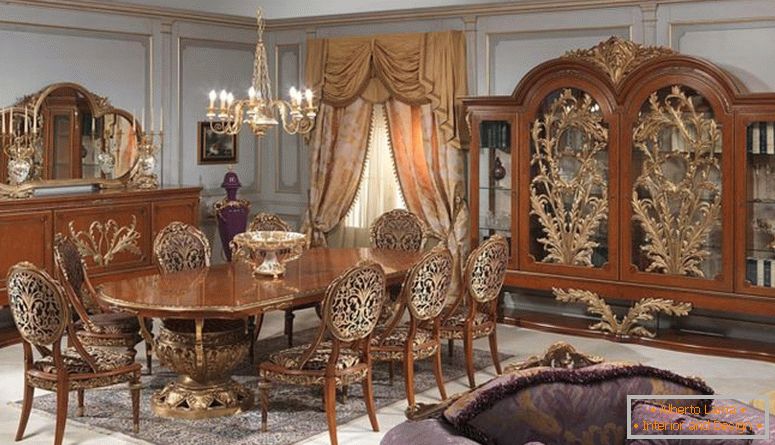 Anglická centrální symetrie. Centrum je rozdělením mezi dvěma světlými otvory, které jsou zarámovány těžkými závěsy s lambreky a pick-upy, mělo by se stát přístupem pro přicházející pohled. Krb vyzdobený policem pro sbírky, velké zrcadlo v luxusním rámu, plný délkový portrét - hlavní věc je, že dekorace na centrální ose symetrie opravdu přitahuje pozornost, organizuje prostor kolem sebe.