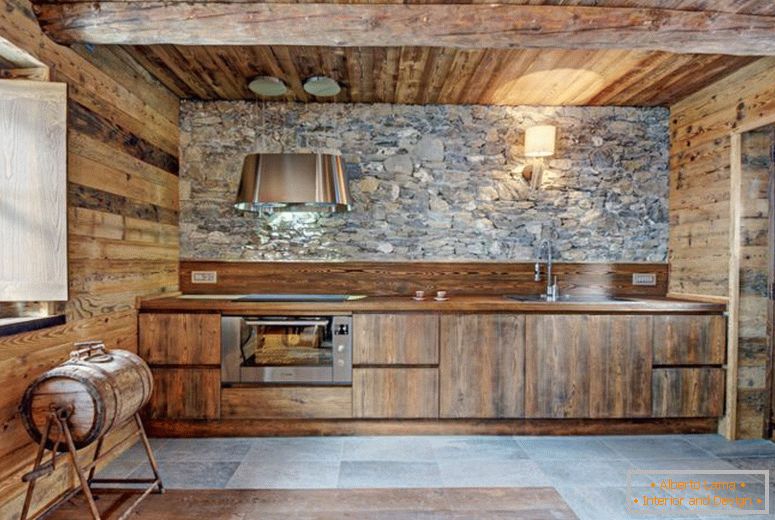 Vrcholem detailů budou přírodní dřevo. Můžete vytvořit podlahy z přírodního dřeva, strop s trámy. Vypadá skvěle a lavičky ze stromu u stolu, krb, který hoří blízko.